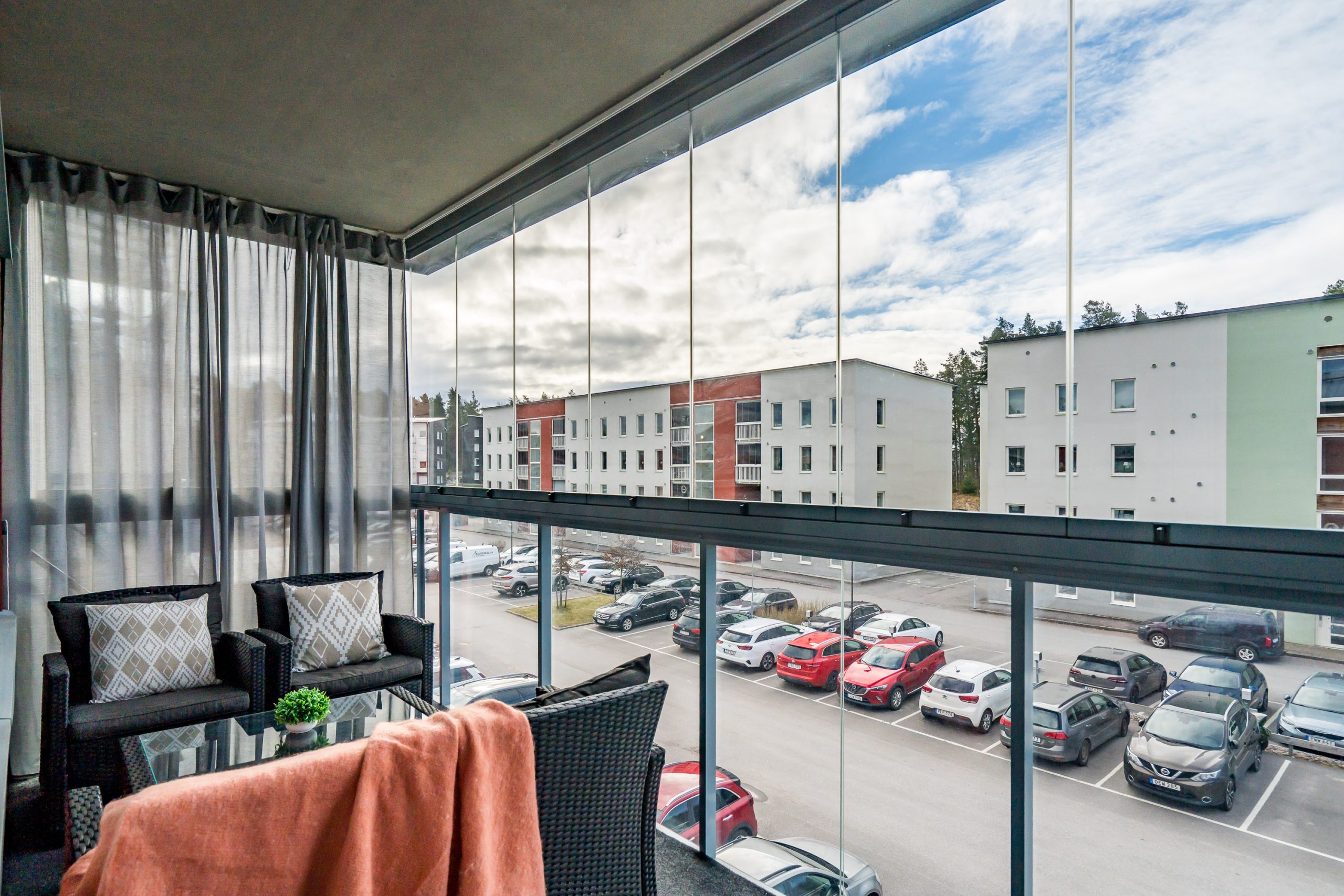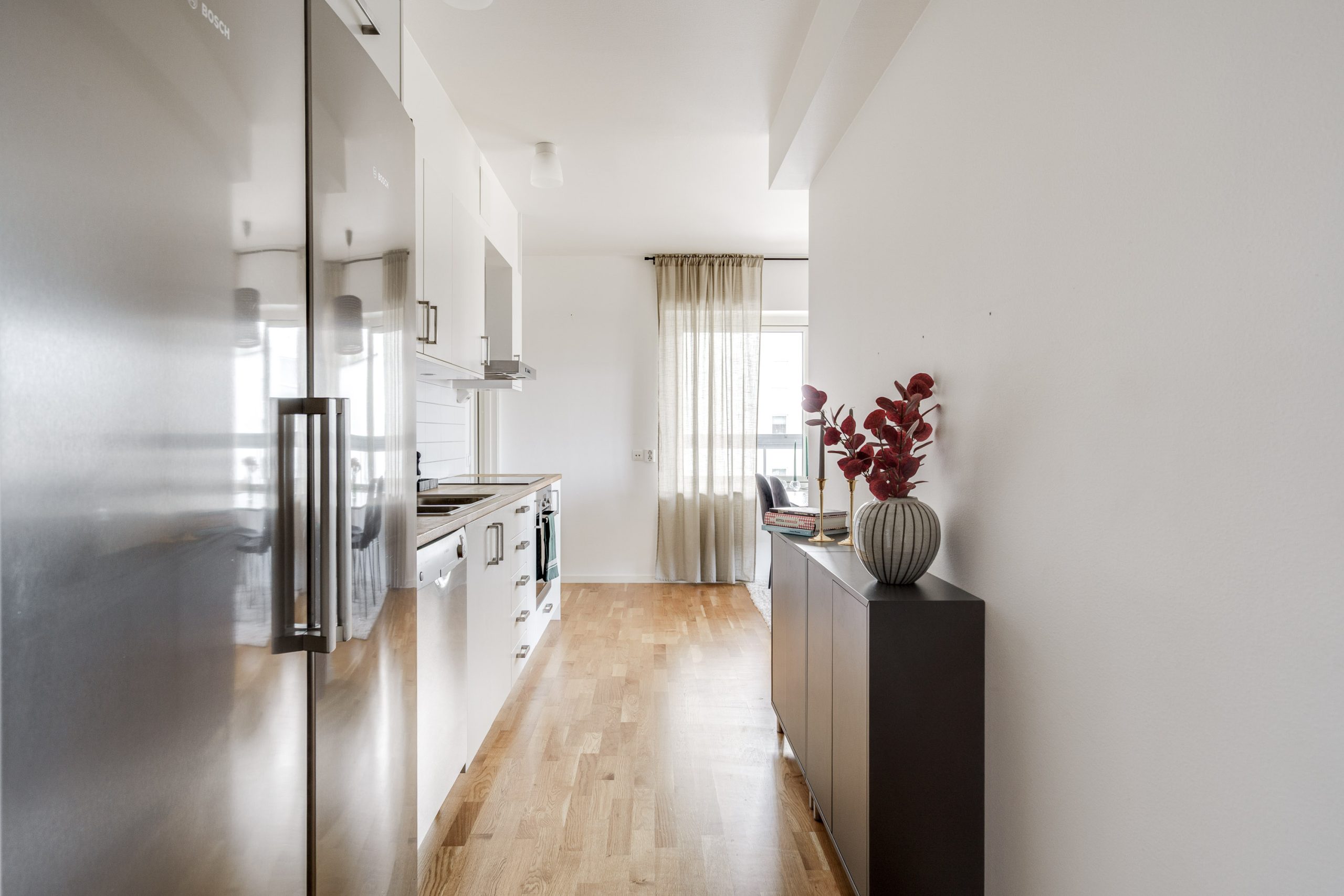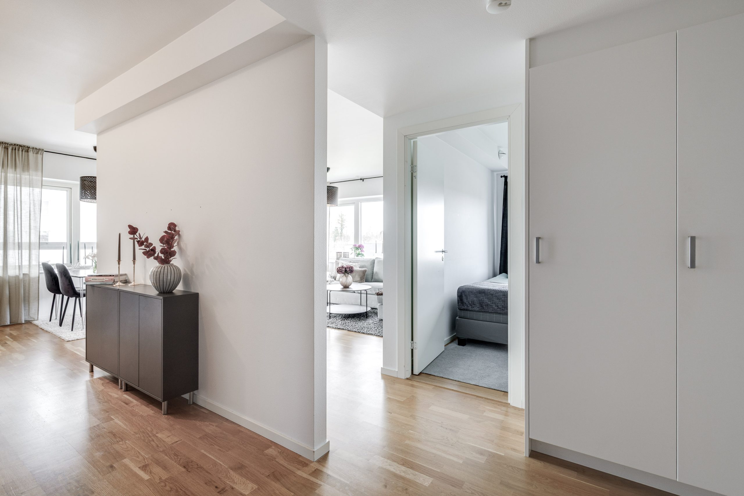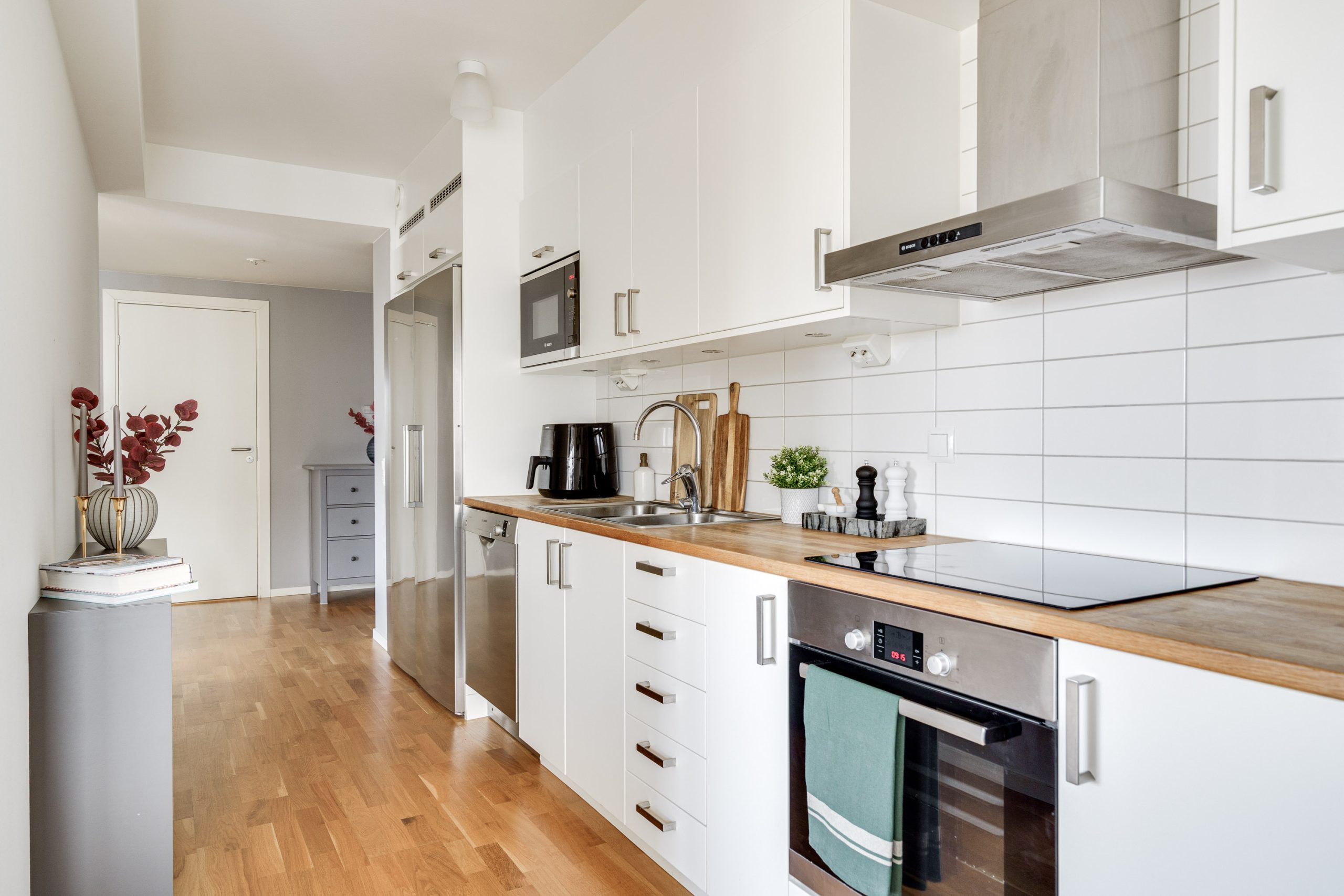 Vardagsrummet har gott om utrymme för både matbord och soffgrupp och blir en naturlig plats för umgänge och middagar. Här nås den inglasade balkongen som även den bjuder på utrymme för soffgrupp och många soltimmar i söderläge. Två sovrum är praktiskt belägna i olika ändar av lägenheten. Det ena sovrummet har garderober för mycket förvaring och det andra sovrummet används som gästrum. Köket har vita luckor samt en praktisk bänkskiva i trä. Maskinell utrustning i köket: Kyl/frys, diskmaskin, spisfläkt , spis med induktionshäll och ugn (vitvaror Bosch). Helkaklat badrum med tvättmaskin, torktumlare samt avlastningsbänk.