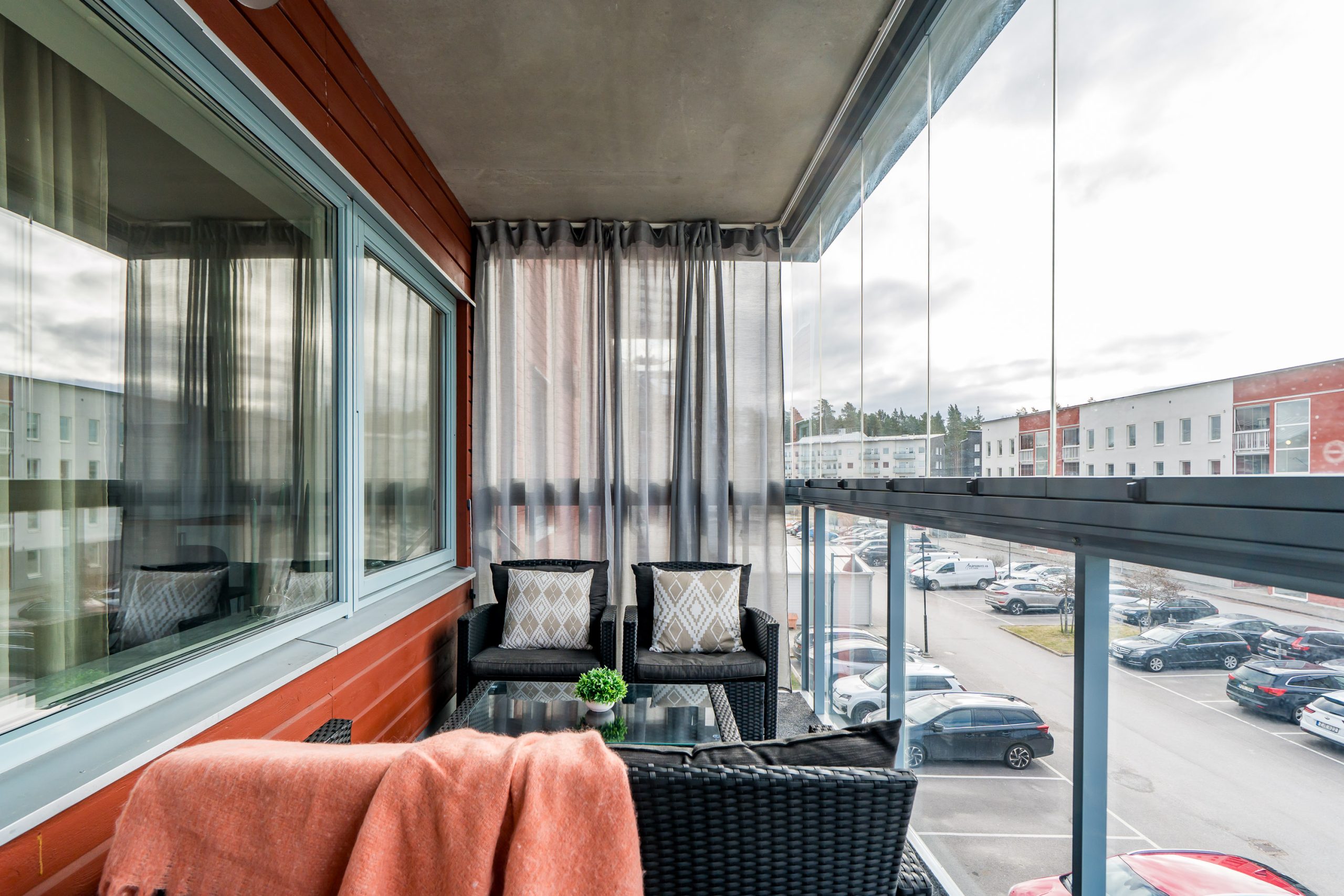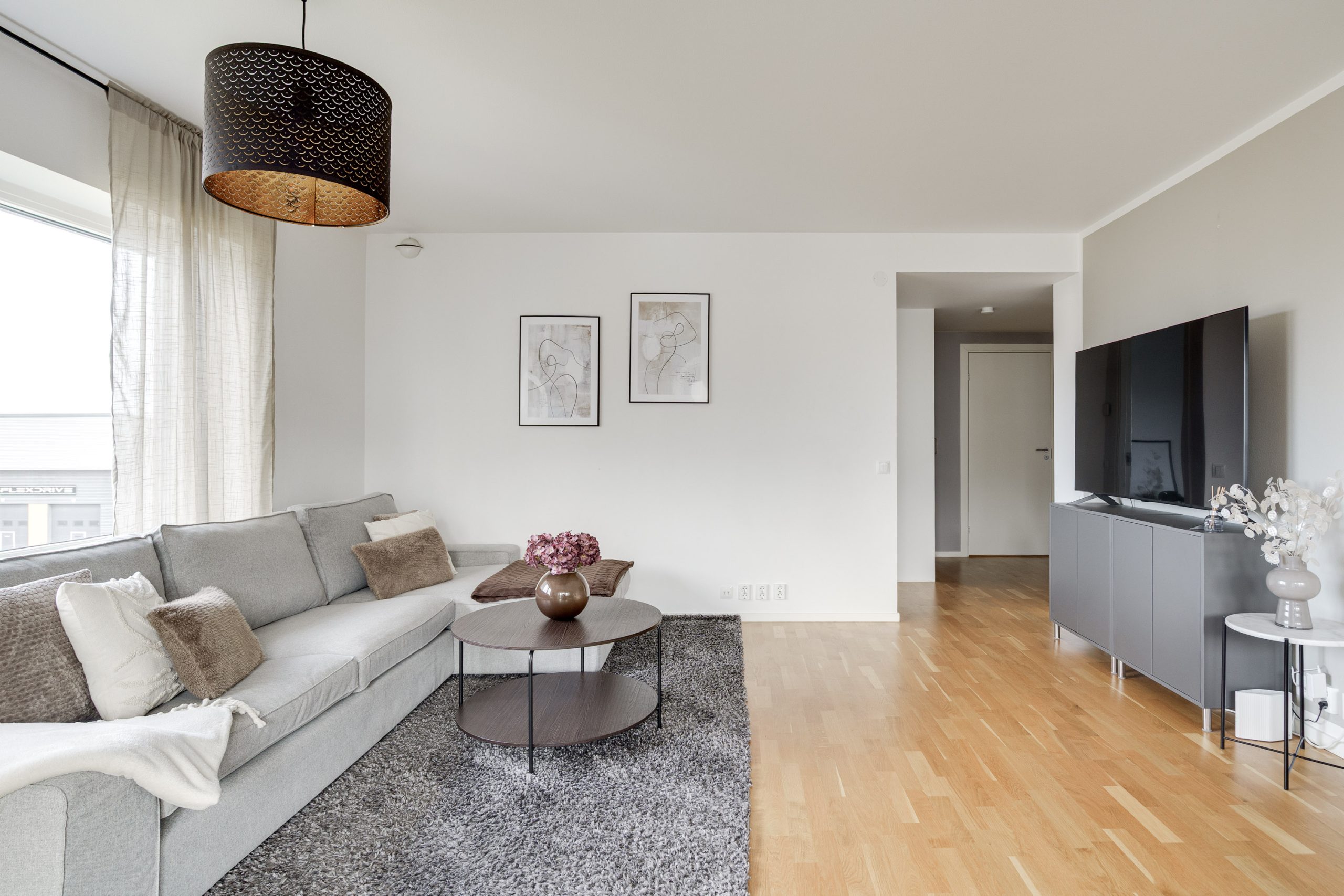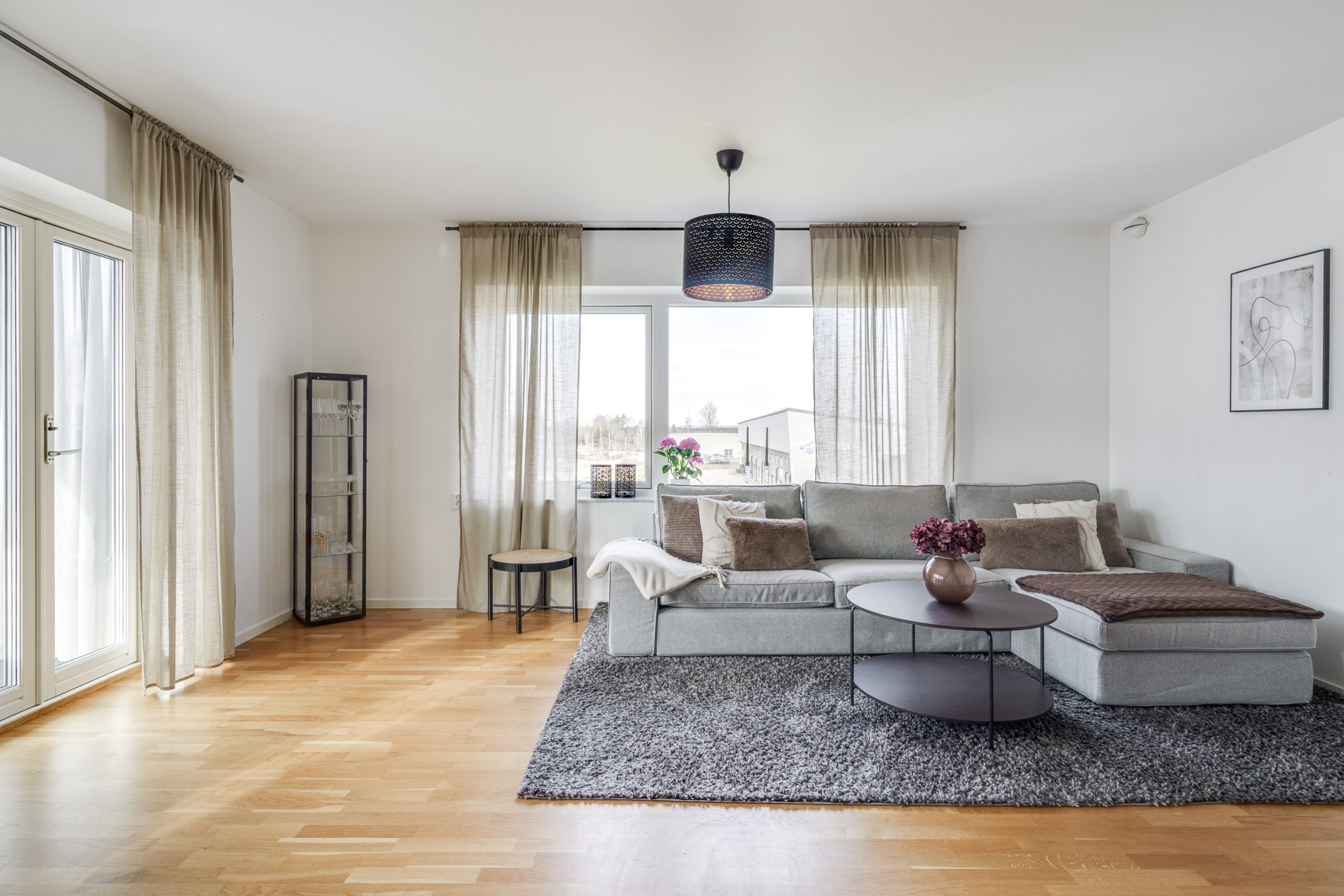 Vardagsrummet har gott om utrymme för både matbord och soffgrupp och blir en naturlig plats för umgänge och middagar. Här nås den inglasade balkongen som även den bjuder på utrymme för soffgrupp och många soltimmar i söderläge. Två sovrum är praktiskt belägna i olika ändar av lägenheten. Det ena sovrummet har garderober för mycket förvaring och det andra sovrummet används som gästrum. Köket har vita luckor samt en praktisk bänkskiva i trä. Maskinell utrustning i köket: Kyl/frys, diskmaskin, spisfläkt , spis med induktionshäll och ugn (vitvaror Bosch). Helkaklat badrum med tvättmaskin, torktumlare samt avlastningsbänk.