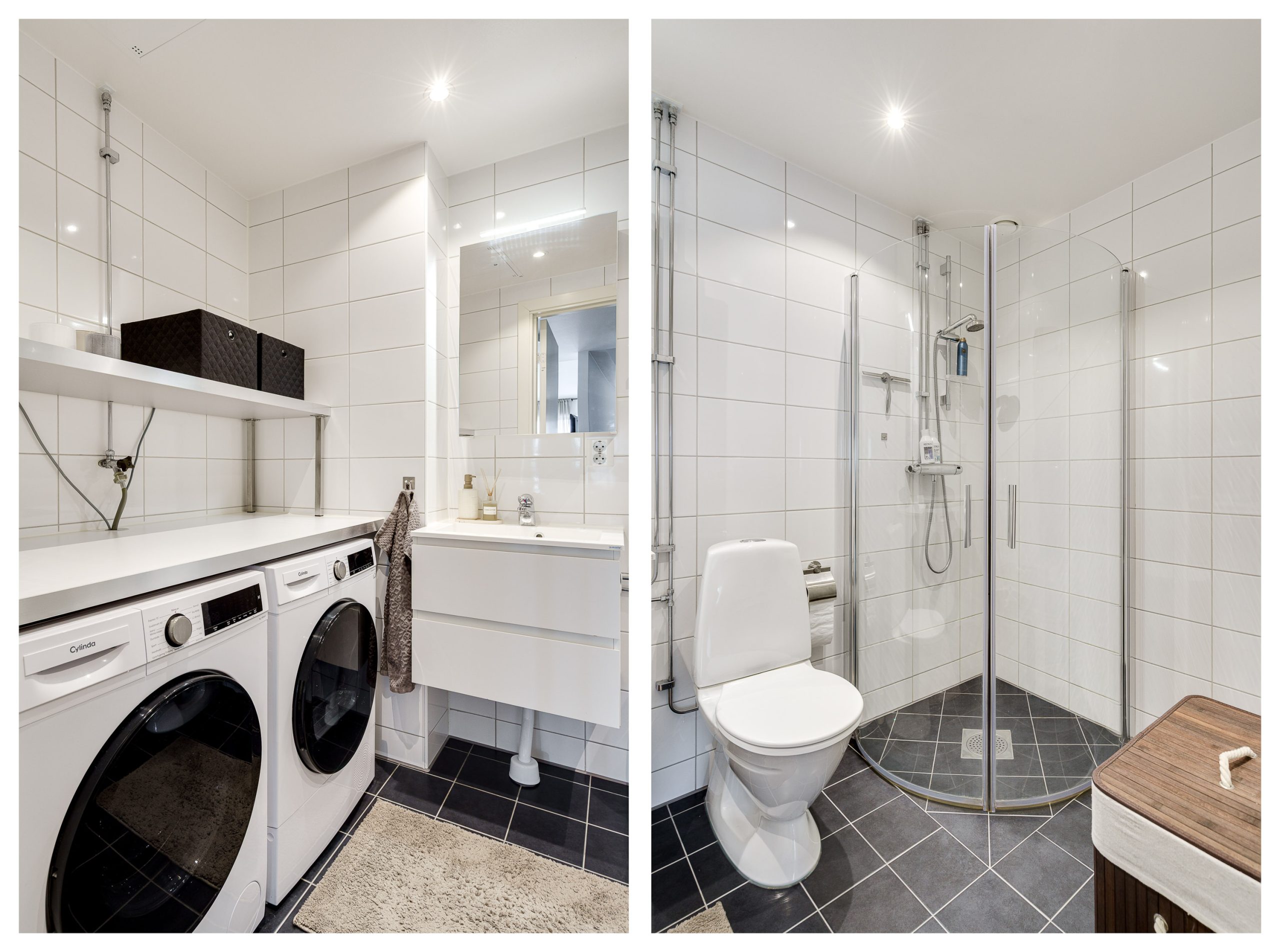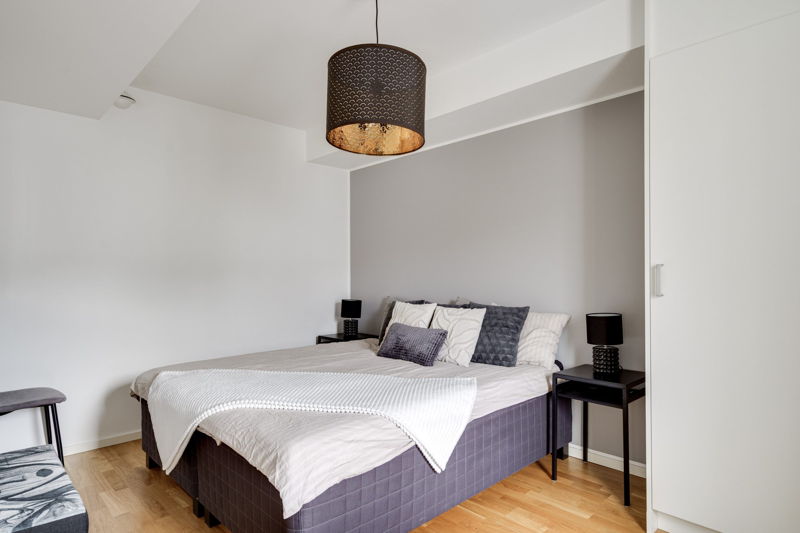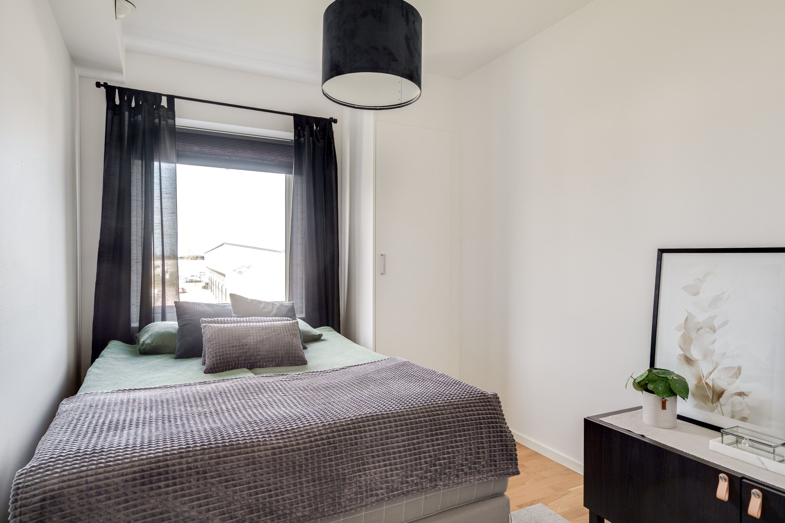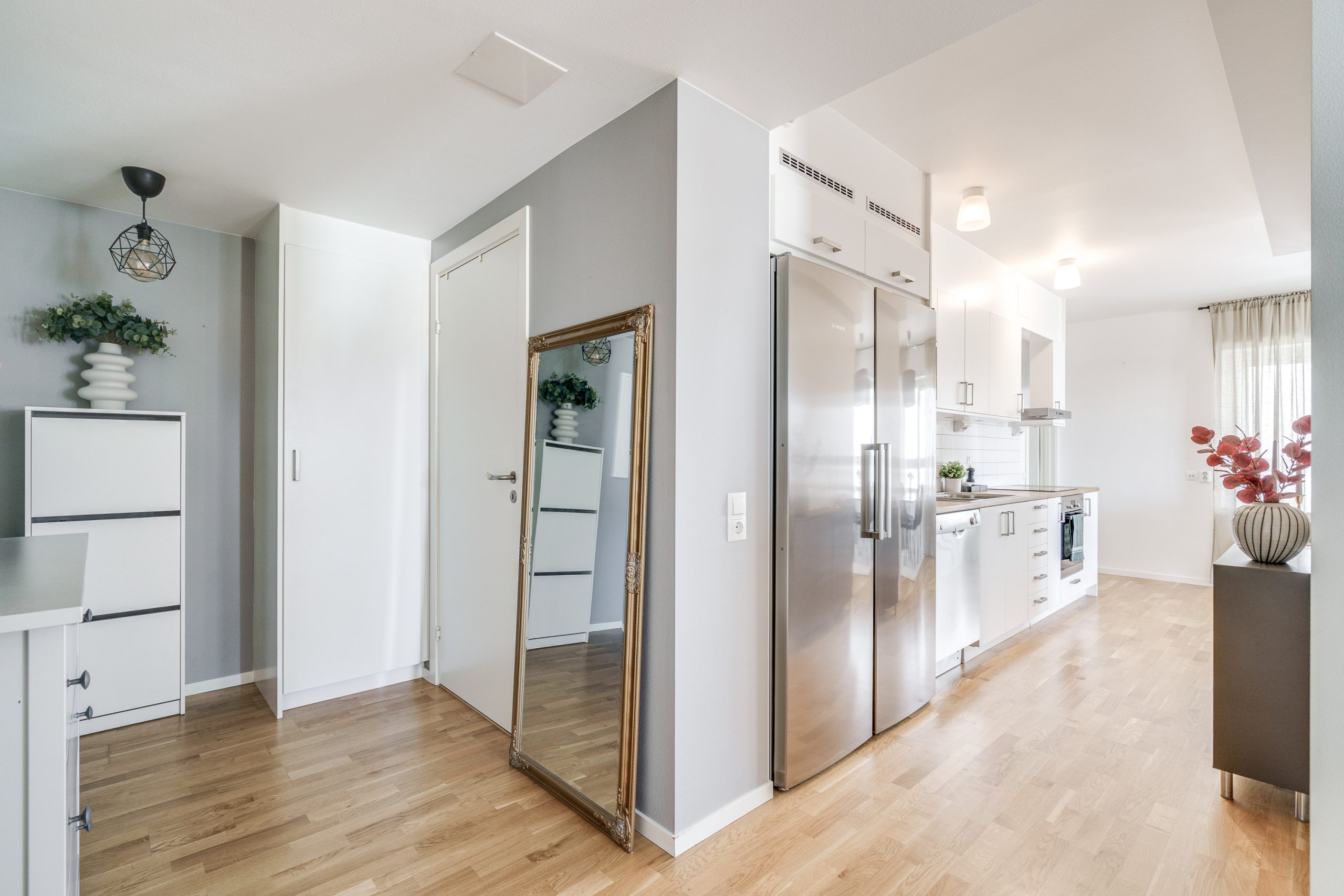 Vardagsrummet har gott om utrymme för både matbord och soffgrupp och blir en naturlig plats för umgänge och middagar. Här nås den inglasade balkongen som även den bjuder på utrymme för soffgrupp och många soltimmar i söderläge. Två sovrum är praktiskt belägna i olika ändar av lägenheten. Det ena sovrummet har garderober för mycket förvaring och det andra sovrummet används som gästrum. Köket har vita luckor samt en praktisk bänkskiva i trä. Maskinell utrustning i köket: Kyl/frys, diskmaskin, spisfläkt , spis med induktionshäll och ugn (vitvaror Bosch). Helkaklat badrum med tvättmaskin, torktumlare samt avlastningsbänk.